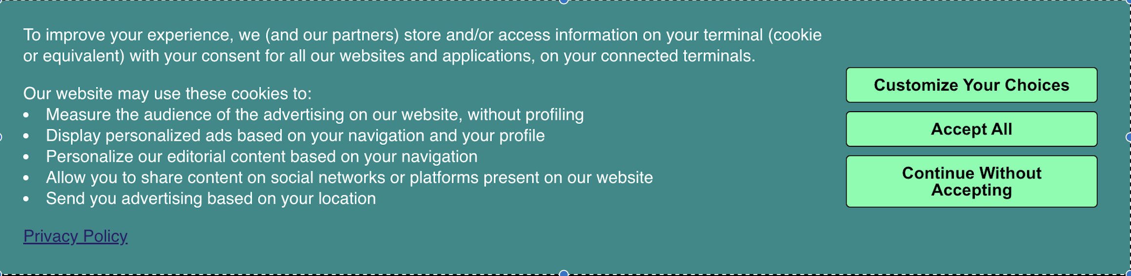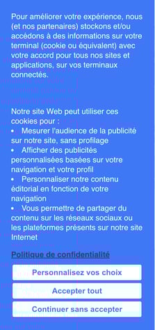 Note that both of these banners are compliant with the French DPA’s GDPR guidance even though they look a little different—one is vertically aligned and would appear on the side of the screen while the other is horizontally aligned and would appear at the top; their color scheme is different; and the language they use is different.