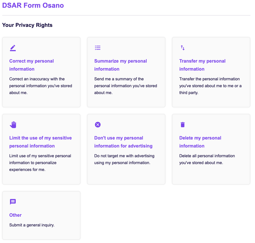 Another interesting aspect about our forms—we offer every subject right universally (some of which are accessible through our “Other” request option), but if we didn’t, Osano allows us to automatically offer request types based on the data subject’s jurisdiction.