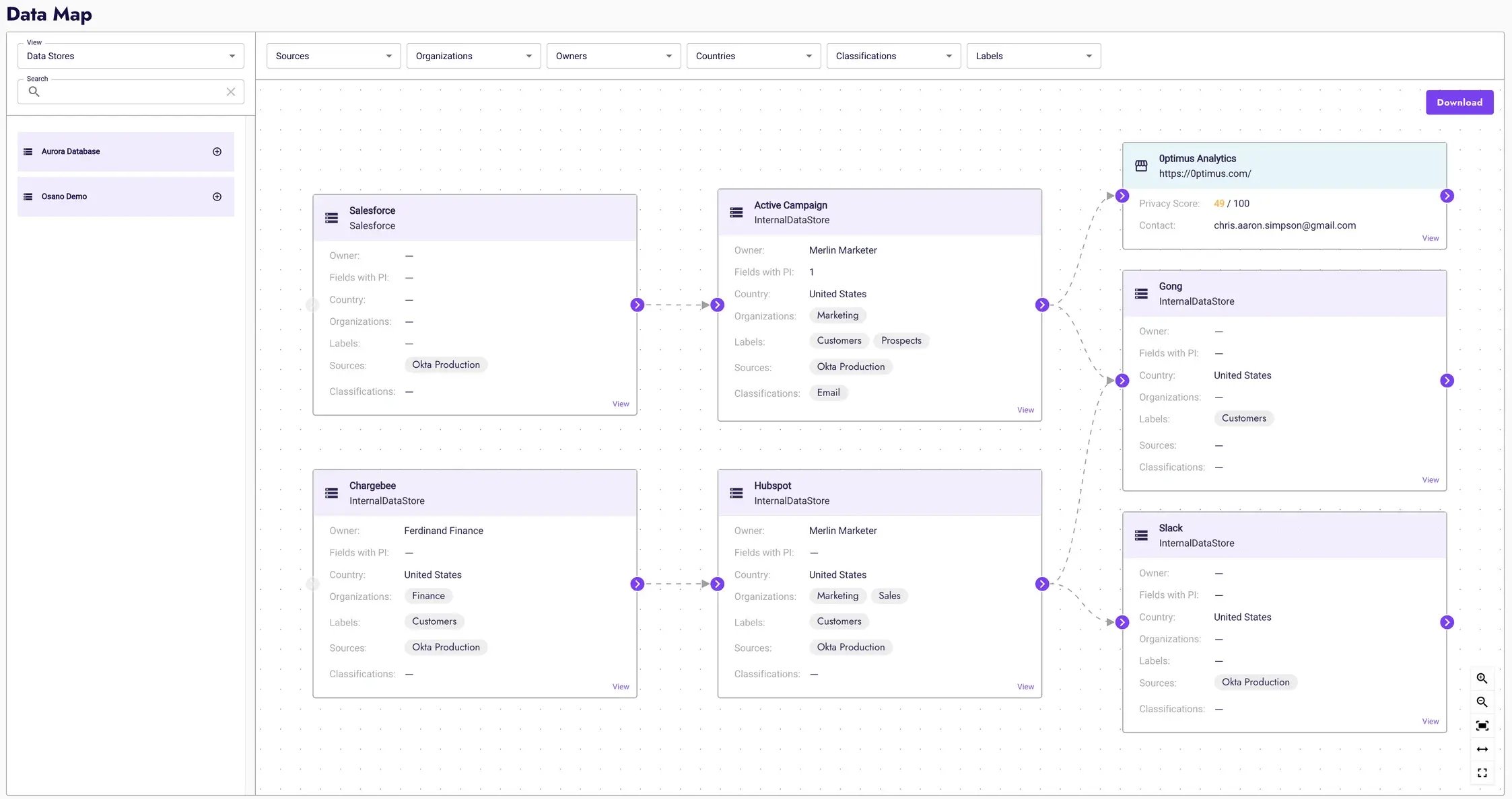 Osano can search through our systems because we use another Osano module to facilitate SRRs—our data mapping functionality. Any system connected to our single-sign-on (SSO) provider is discoverable to Osano, enabling us to search through systems for a data subject’s information automatically. We use our SSO to connect to systems, but Osano also connects to customer data platforms (CDPs) like Segment or RudderStack and cloud database services like Amazon Aurora RDS. Individual data stores that aren’t connected to sources like an SSO, CDP, or cloud database can be added manually as well.