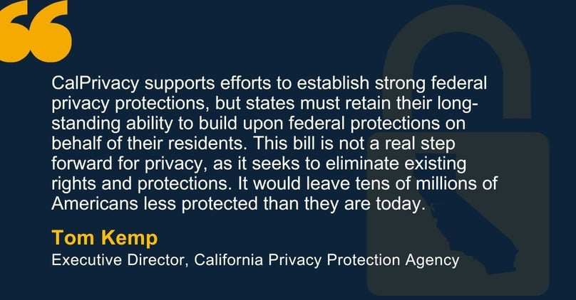 State-level privacy advocates are equally critical. Tom Kemp, Executive Director of CalPrivacy, issued a statement calling it "not a real step forward for privacy," arguing the bill "seeks to eliminate existing rights and protections" and "would leave tens of millions of Americans less protected than they are today."