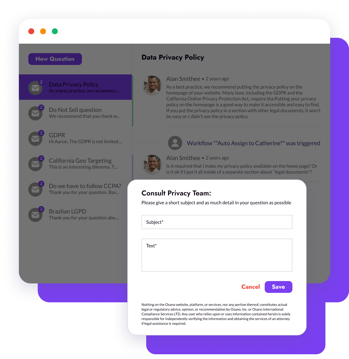 Your legal counsel provides invaluable advice, but it’d be nice to be able to ask a quick question without paying hundreds of dollars for the privilege. Rather than suffer a death of a hundred papercuts, save on fees by posing your question to Osano’s team of experts.