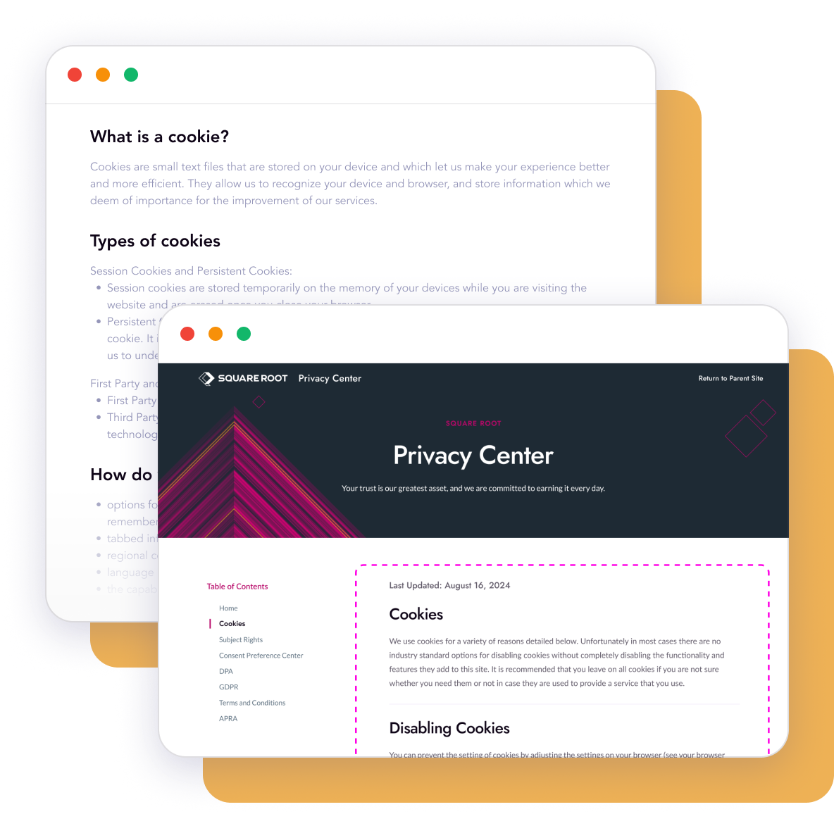 Consolidate policy management, GDPR representation, and transparency tools in one privacy center. Empower your team while ensuring visible privacy with regulators, consumers, and stakeholders.