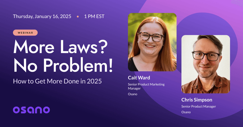 With more privacy laws to keep track of in 2025, you may be expecting a bigger workload than last year. That doesn’t have to be the case. In this webinar, Osano’s Cait Ward and Chris Simpson teach you how to move faster, gain visibility, shorten the time to deploy banners and assessments, and automate in all the right places.