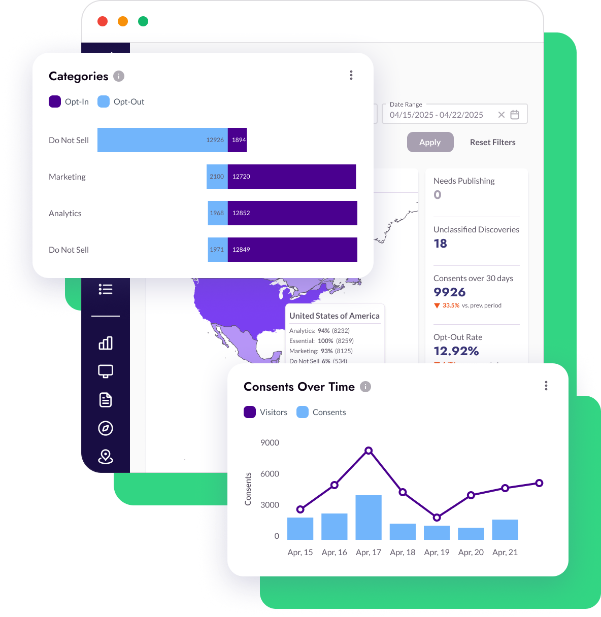 Clearly and effortlessly demonstrate your compliance—consent, SRRs, and policy management—on your web site and mobile apps.