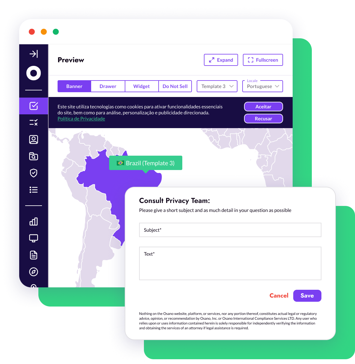 Osano’s solutions support compliance with over 95 data privacy regulations worldwide. Manage consent and subject rights according to a data subject’s governing law and jurisdiction.