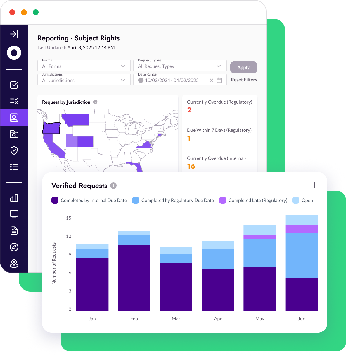 In-app dashboards and reporting let you track risk and compliance metrics like SRR deadlines, outstanding assessments, and consent and preference choices.