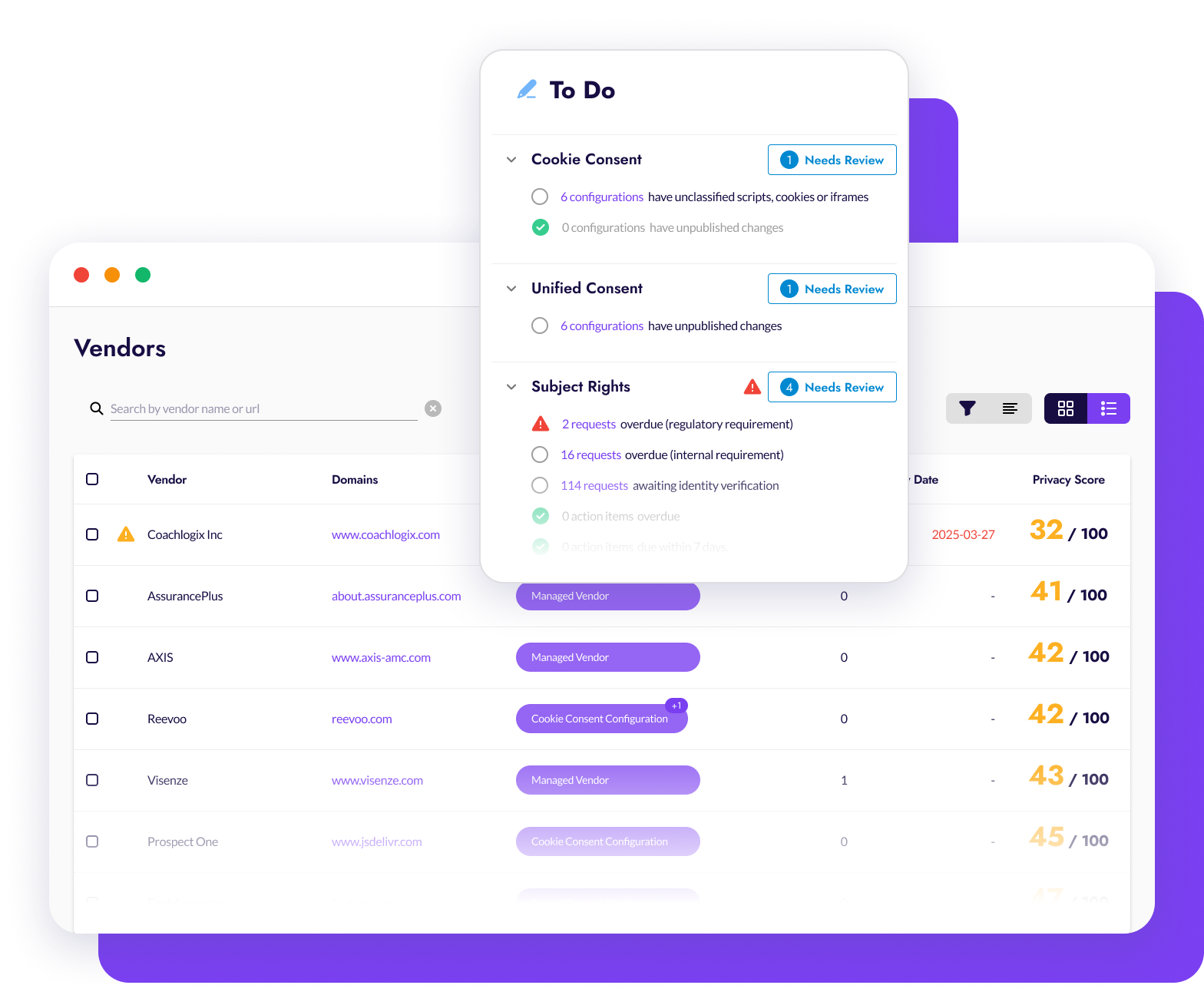 - Vendor risk management using Osano’s Vendor Score, a proprietary 163-point scoring ontology based on machine learning and expert input.