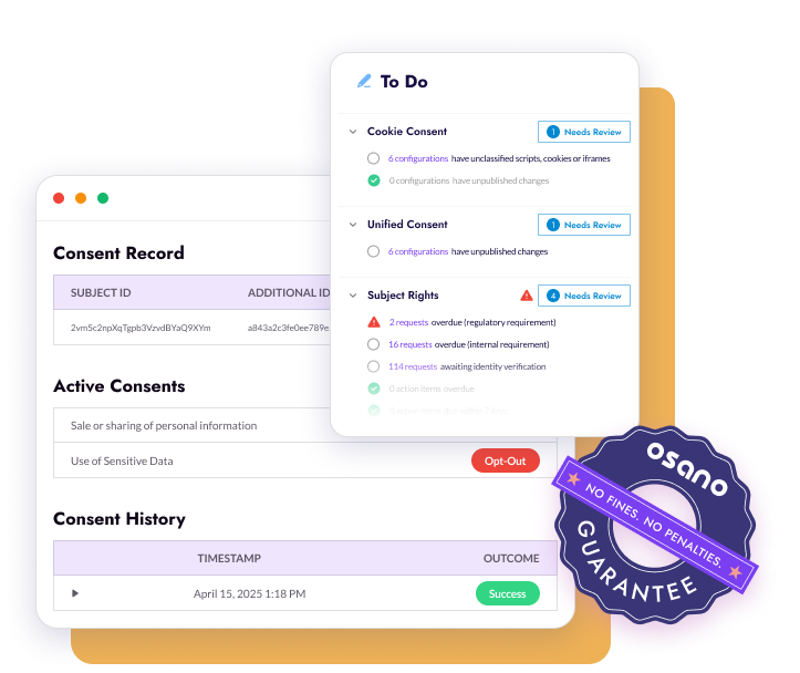 Osano lets you manage privacy effectively and still have time for your day job. Intuitive tools, clear dashboards, and privacy experts to answer your questions help you work quickly and avoid fines. We guarantee it.