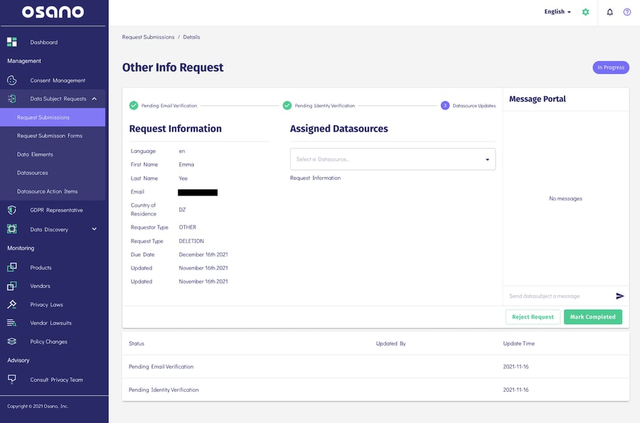 But sometimes, Osano customers need to talk to data subjects about those requests. For example, a company fulfilling a DSAR might need to say to the data subject: "Can you please verify your full name and date of birth? The information you sent doesn't match ours."